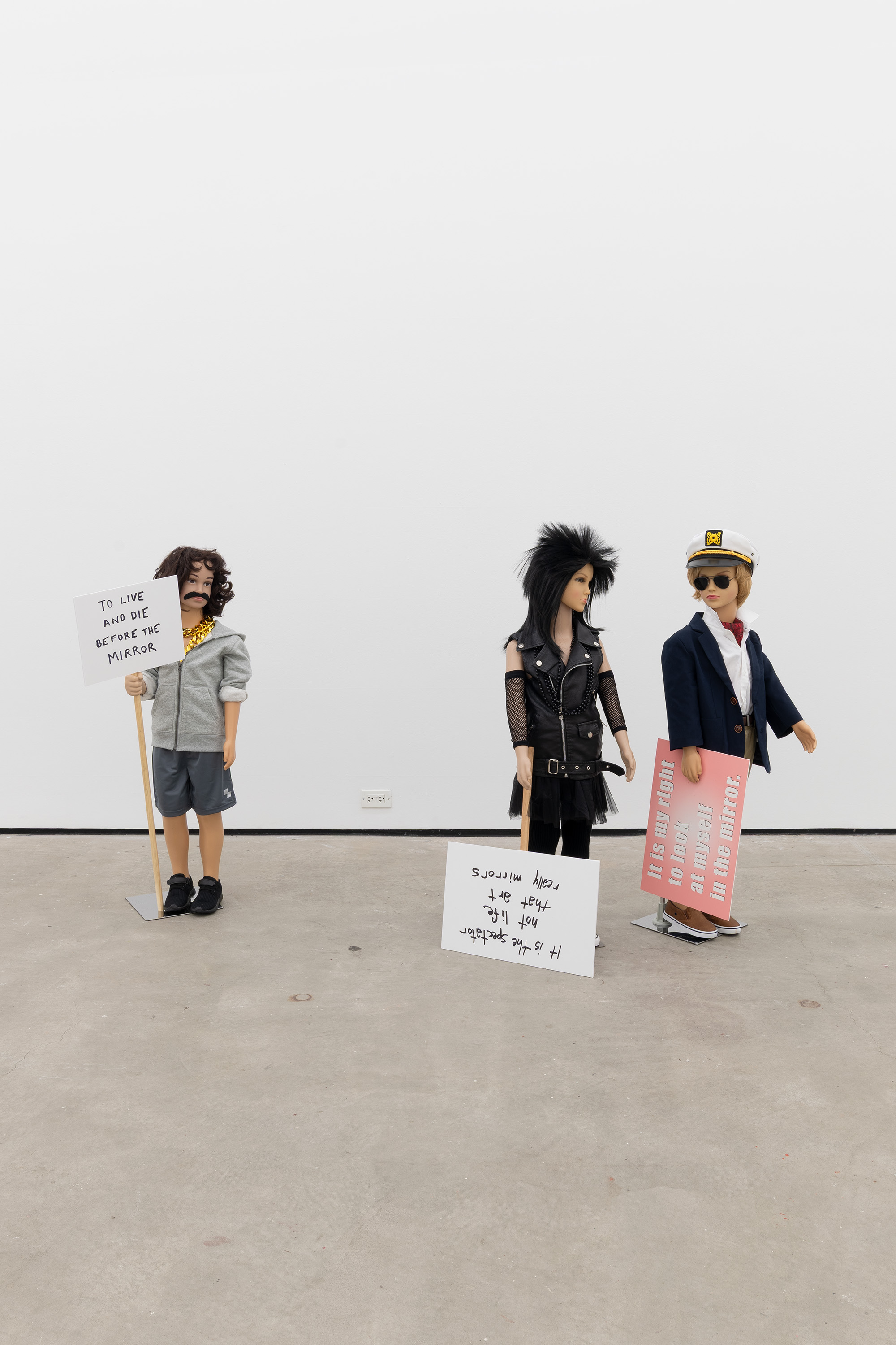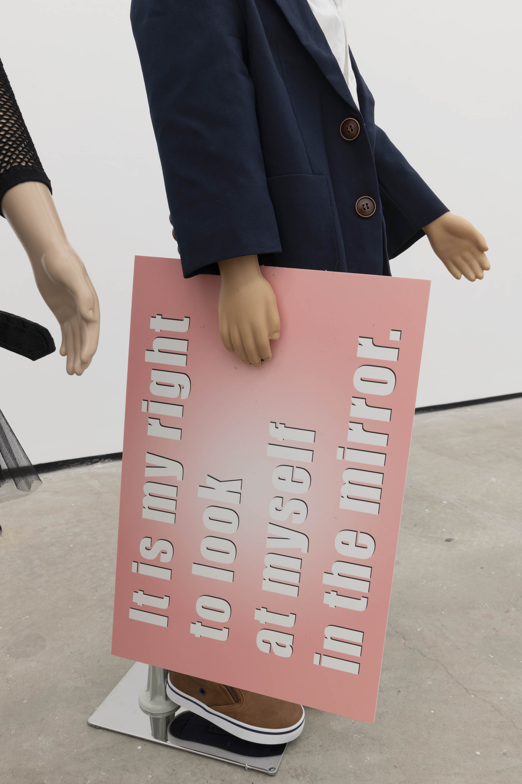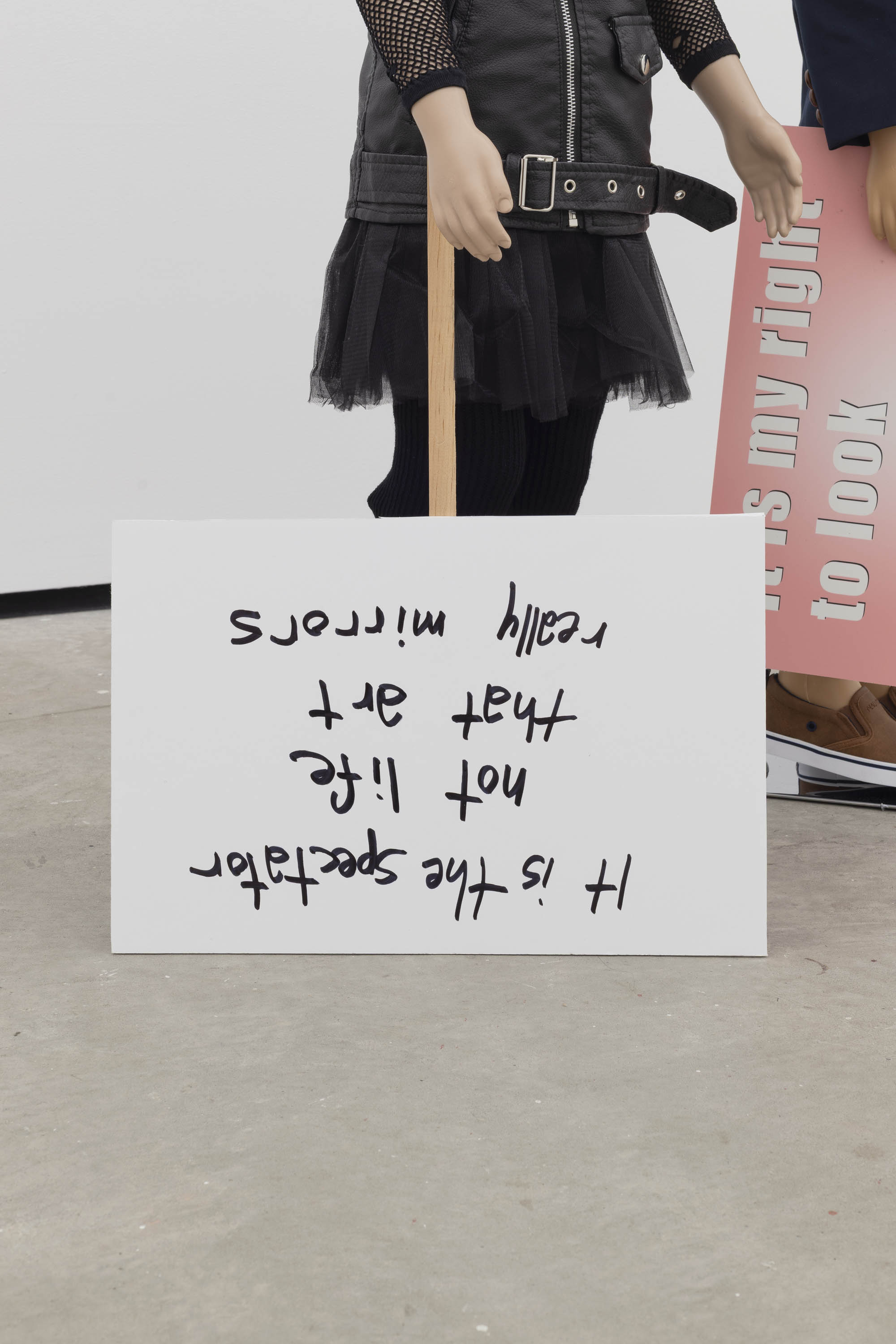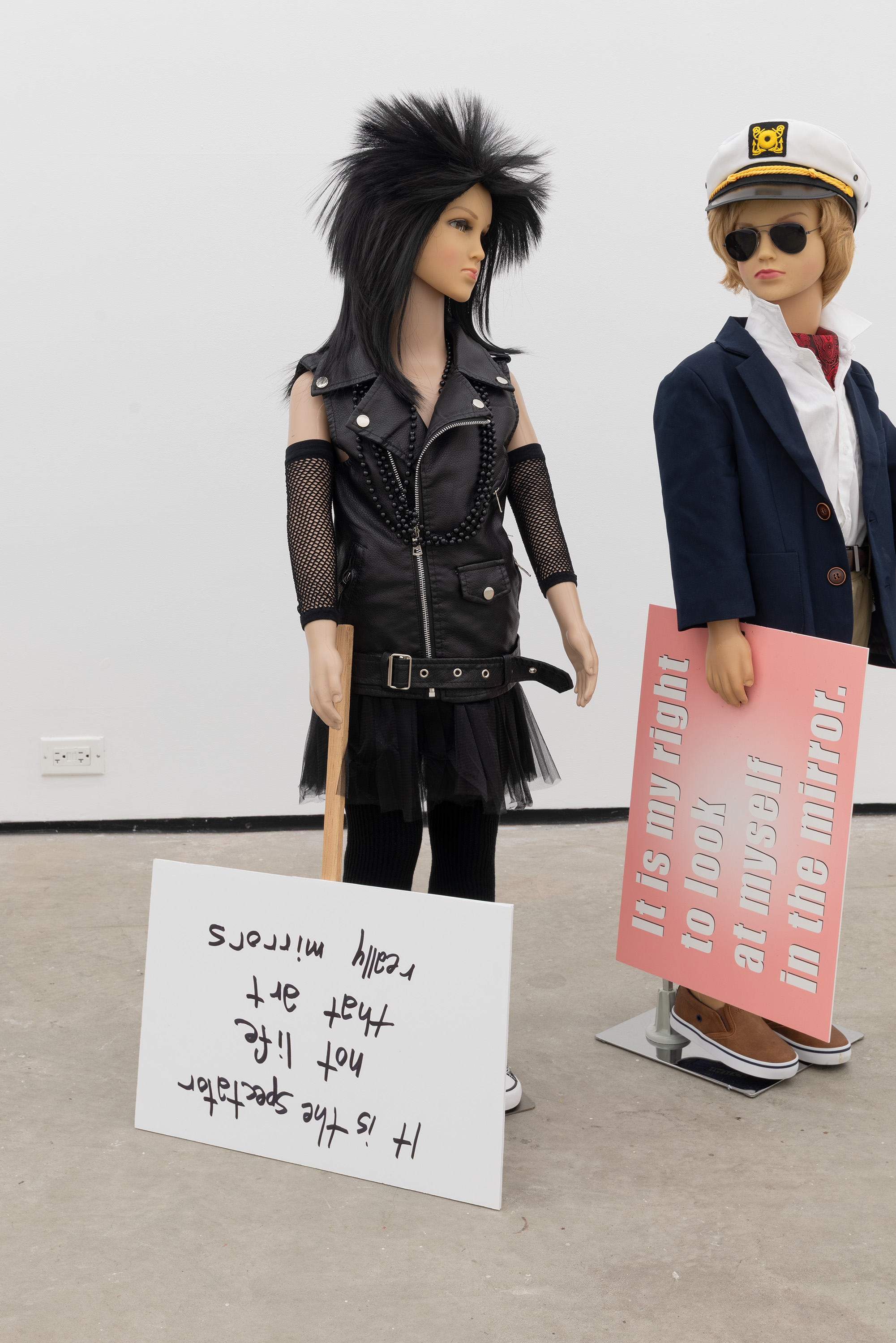 Plastic mannequin, steel mannequin stand, acrylic wig, clothing, sneakers, and magic marker on foam-core with wooden handle