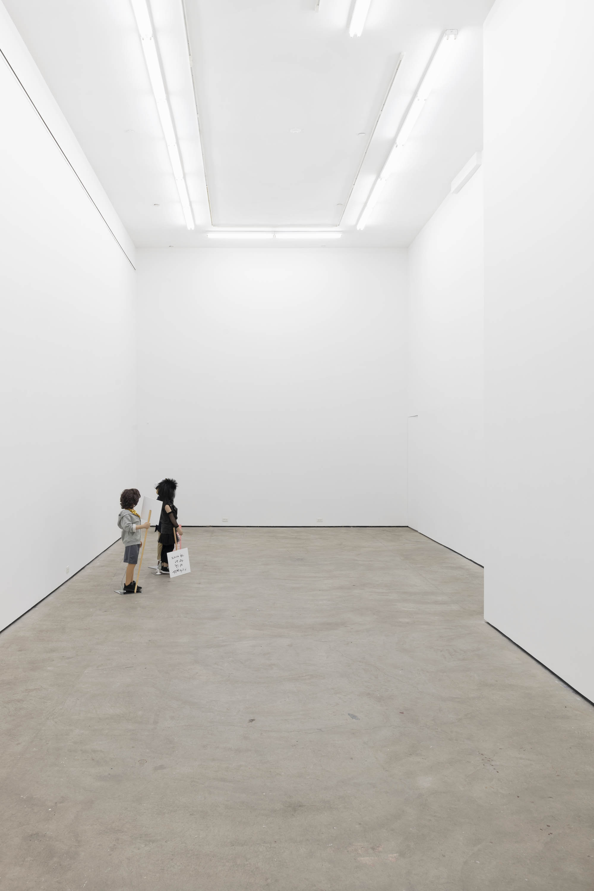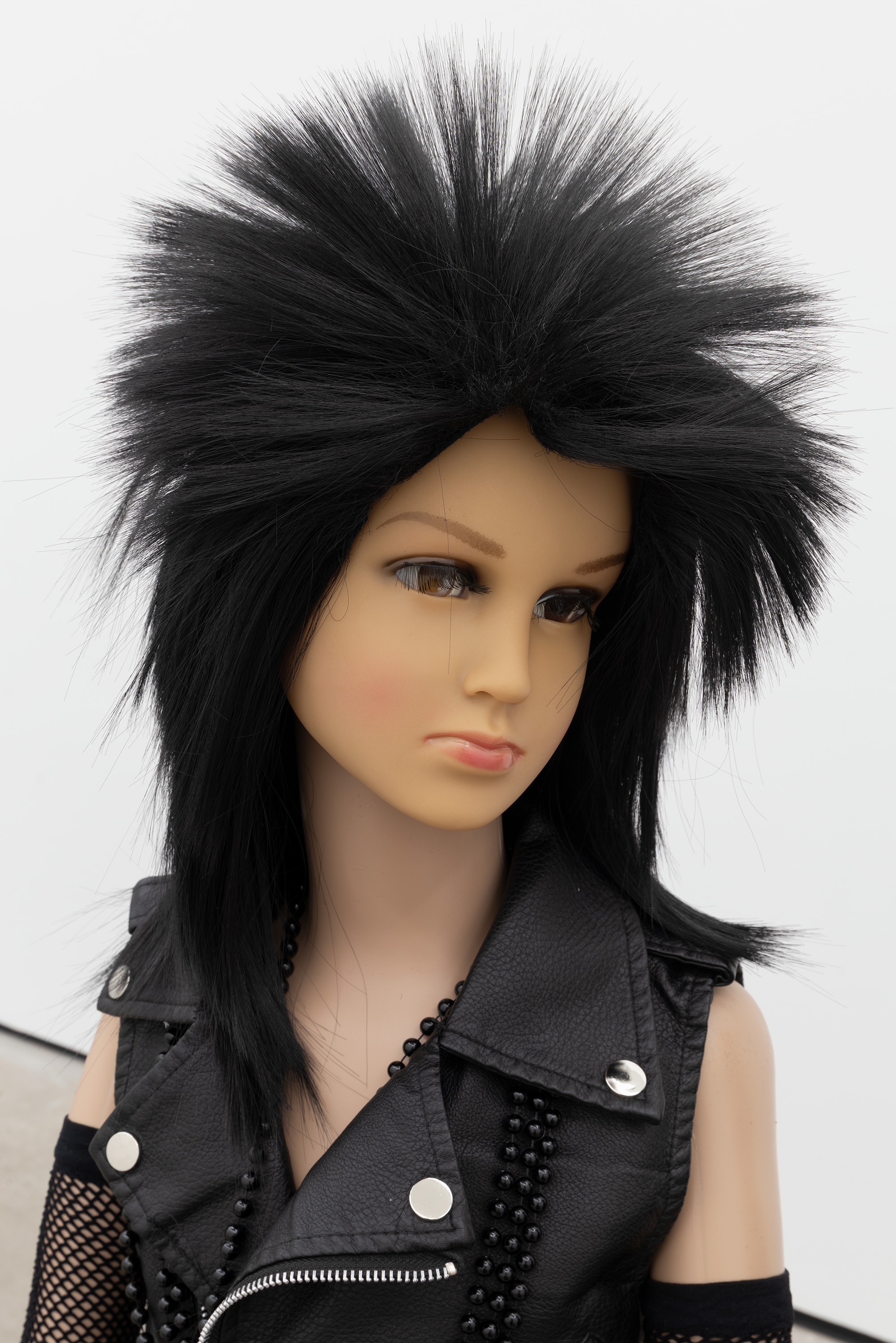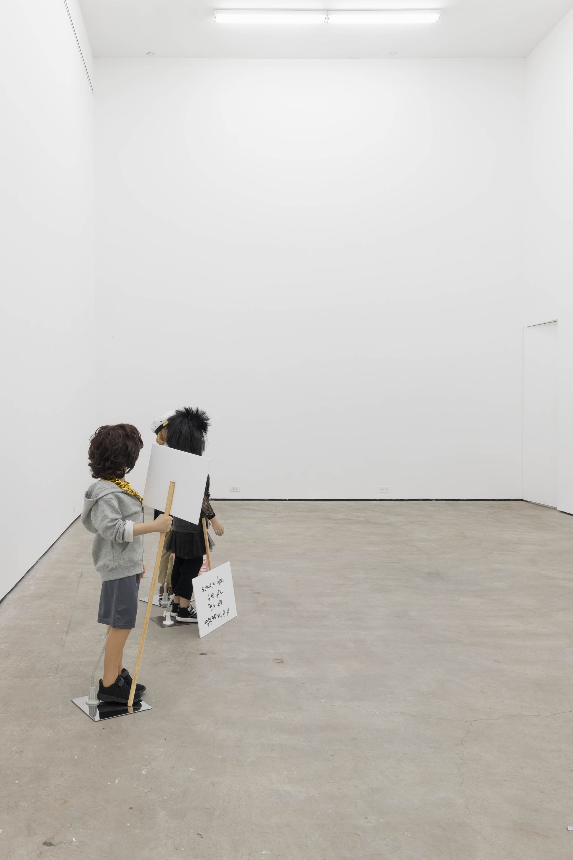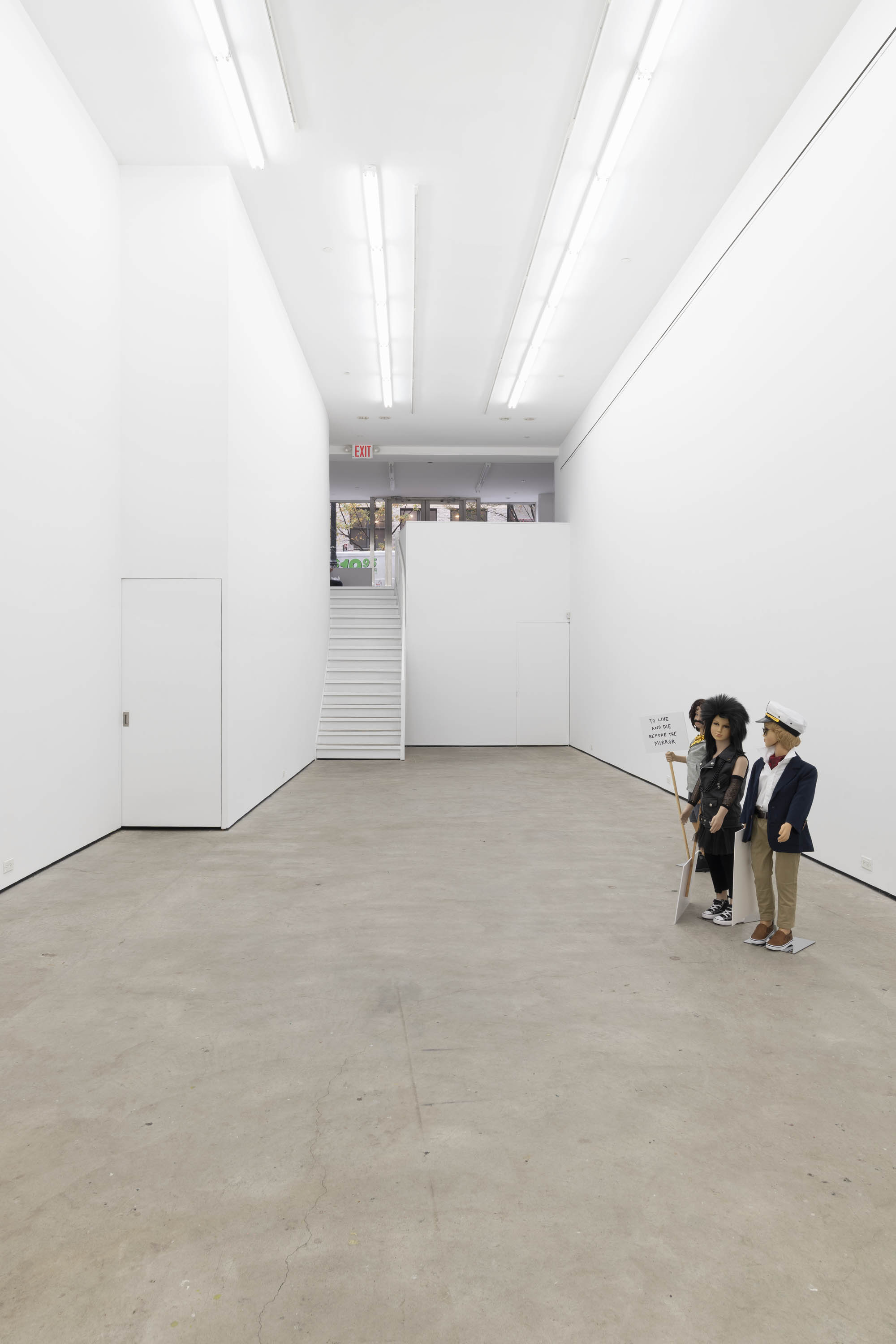 Plastic mannequin, steel mannequin stand, acrylic wig, clothing, sneakers, and magic marker on foam-core with wooden handle