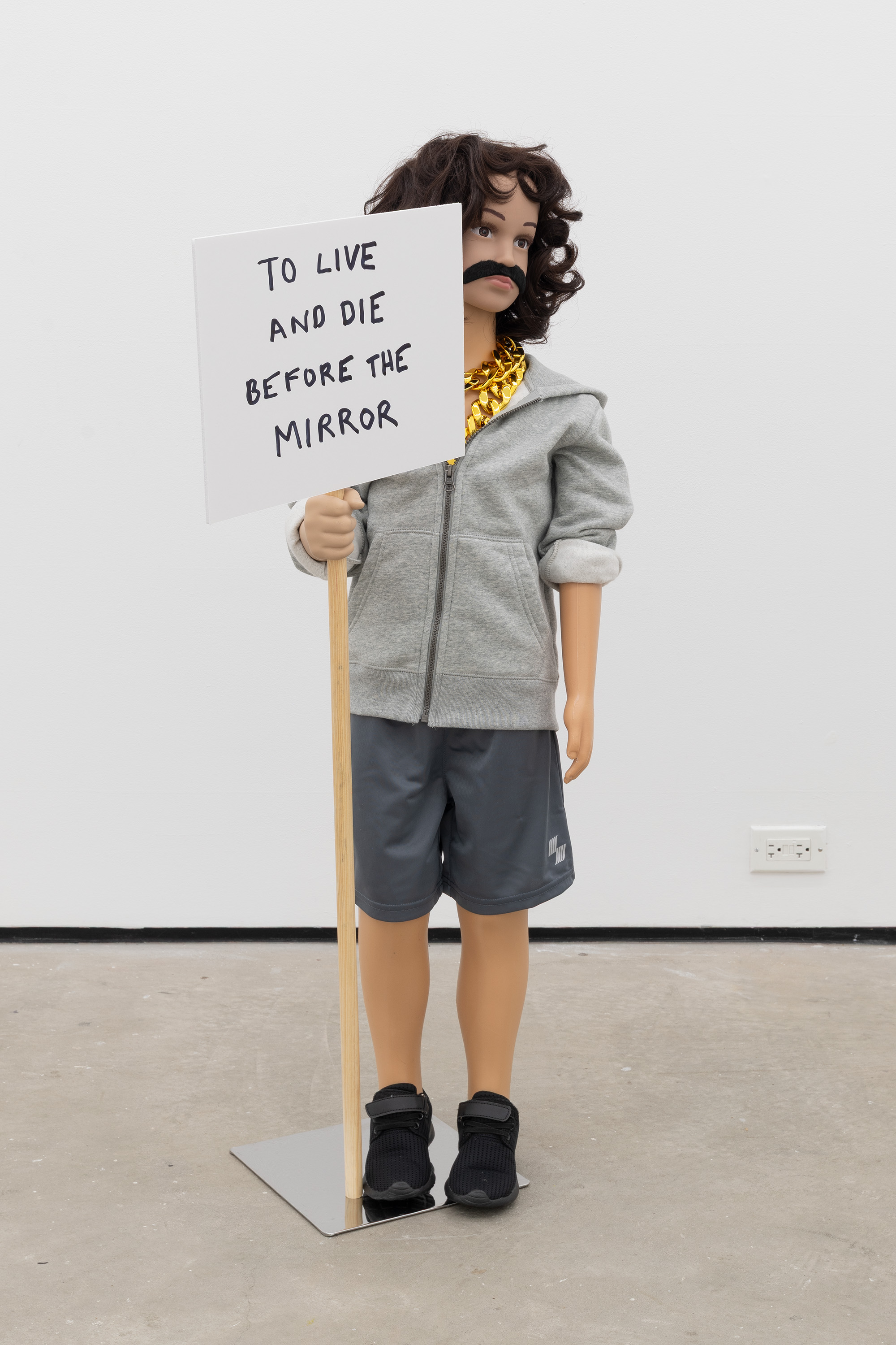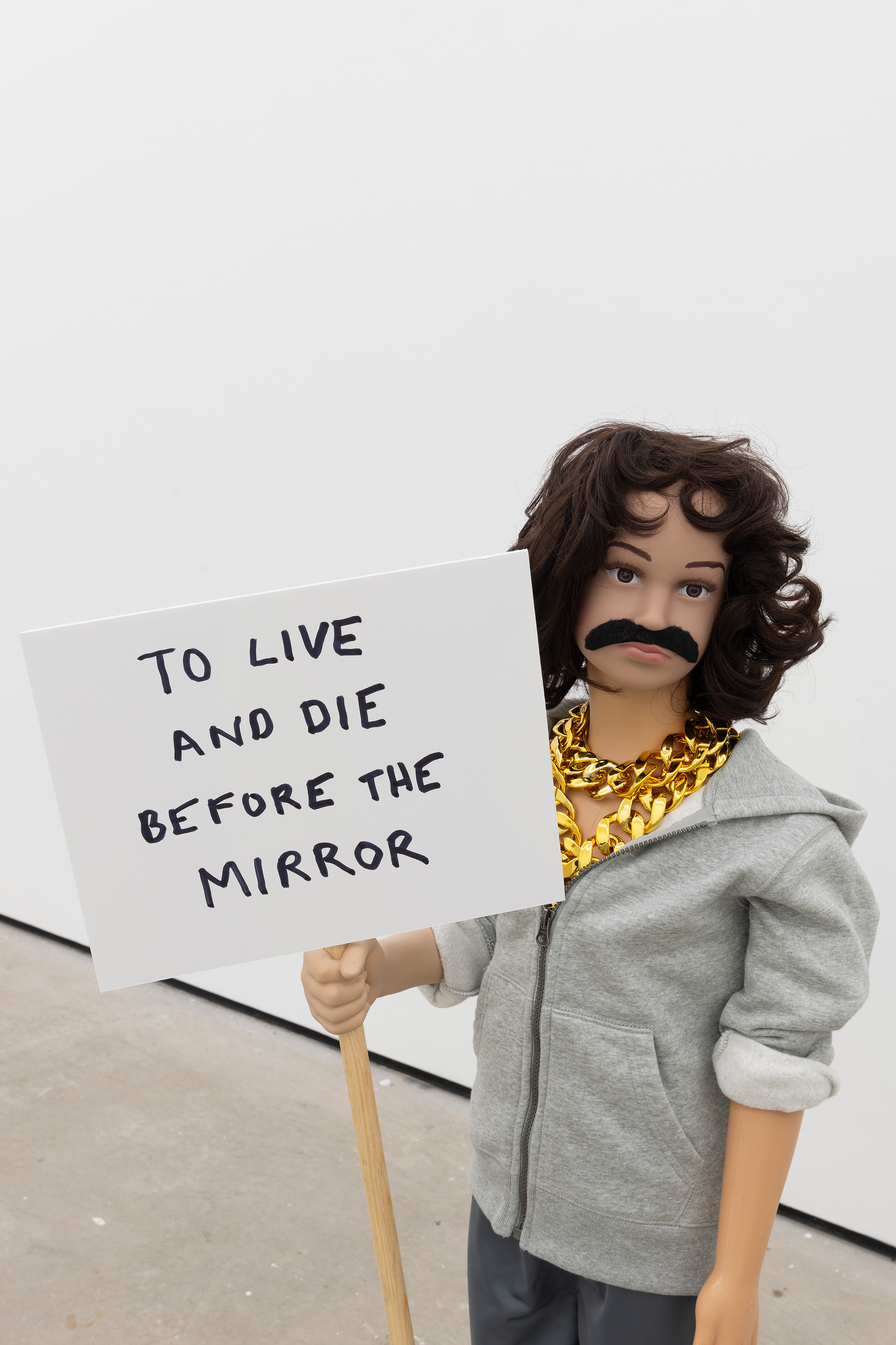 Plastic mannequin, custom 3D-printed arm, steel mannequin stand, acrylic wig, fake moustache, clothing, plastic chain necklace, sneakers, and magic marker on foam-core with wooden dowel handle