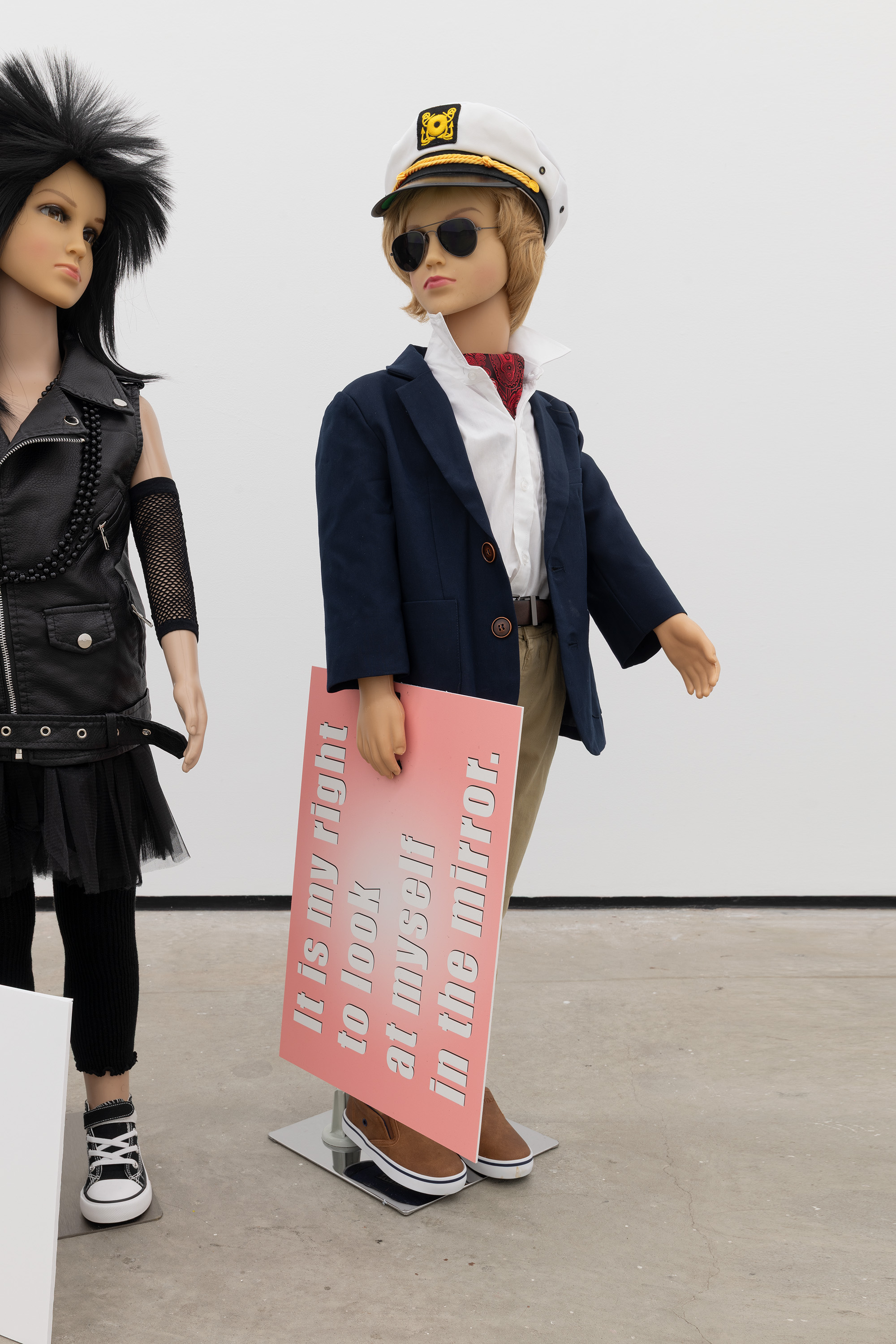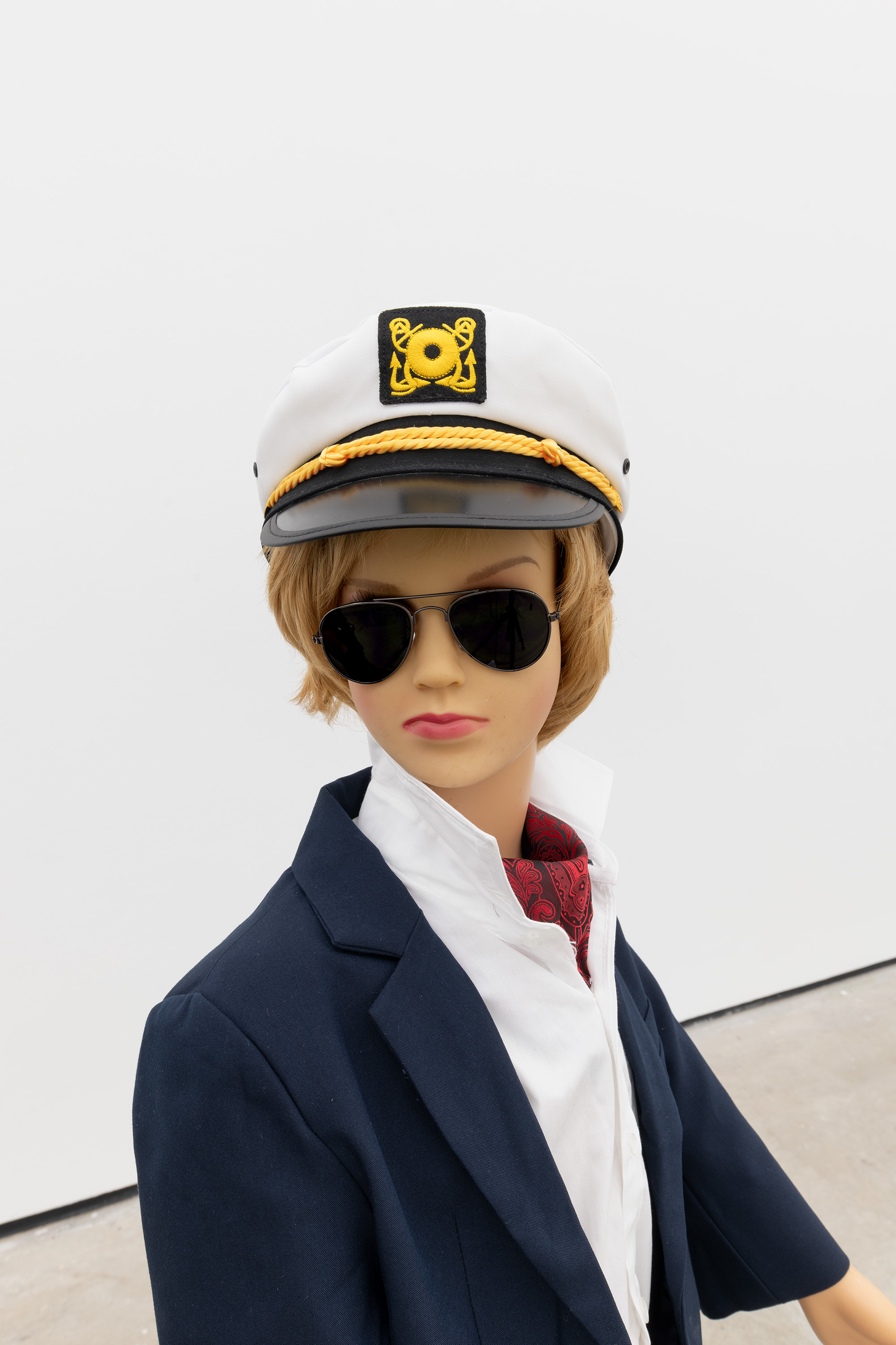 Plastic mannequin, steel mannequin stand, acrylic wig, clothing, nautical cap, loafers, sunglasses, and UV print on sintra